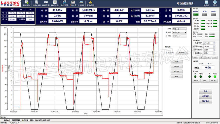 執行器測試臺根據動力源的類型可以分為:電動執行器測試臺、氣動執行器測試臺、液動執行器測試臺、撥叉式氣動執行器測試臺。 執行器測試臺根據運動方式的類型可以分為:角行程、多回轉、直行程執行器測試臺。本測測試系統由加載裝置、轉矩轉速傳感器、測試臺架、執行器安裝夾具、檢測柜等組成,它可以任意改變被測執行器的負載,直接測量出執行器負載耐久狀態下的輸出轉矩、轉速、功率、角度、壓力等參數。電動執行器測試臺是用于全面檢驗和驗證電動執行器(也稱為電動閥門執行器)各項性能的專用設備。電動執行器是閥門、風門等設備的驅動裝置,其可靠性直接關系到整個工業流程的安全與穩定,因此其測試至關重要。