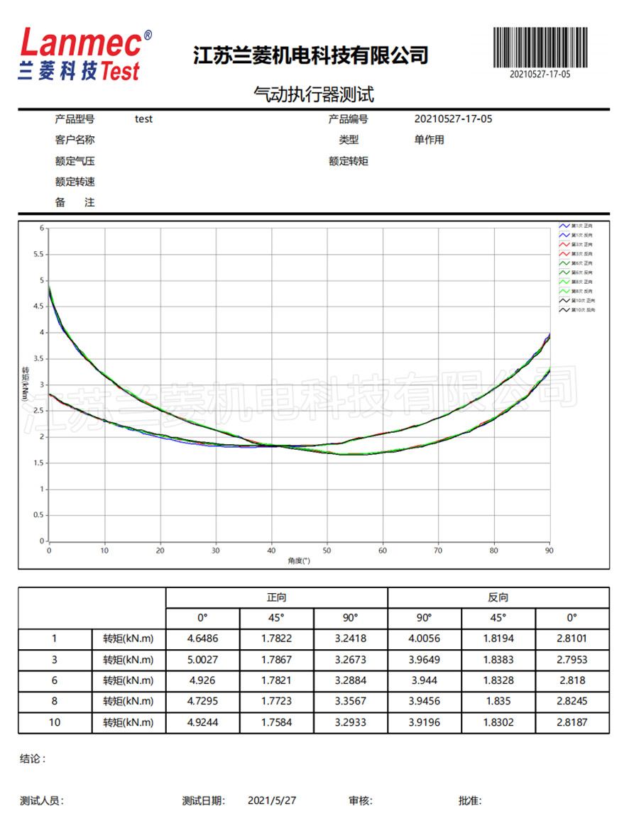 | The 30000N.m fork-type pneumatic actuator test bench customized by Lanmec Technology for Suzhou Neway Valve Co., Ltd. has been debugged and has been affirmed by customers! Equipment functions: 1. Maximum torque test for each angle, automatic adjustment of air pressure (0~1MPa), charging and discharging, automatic control of cylinder stroke, control angle, automatic measurement and recording of angle, air pressure, maximum torque, and forming curves and reports; 2 , Life test, the customer can customize the loading torque, the number of runs, the automatic shutdown if the data is abnormal, and the display of the fault content, to test the quality and service life of the fork-type pneumatic actuator.
